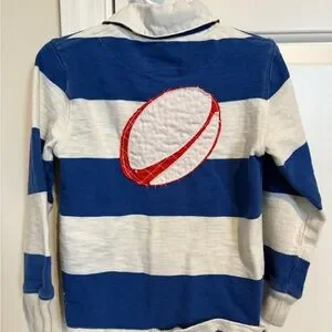 Mini Boden Blue and White striped long sleeve polo with ball appliqué on back.