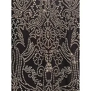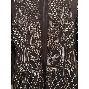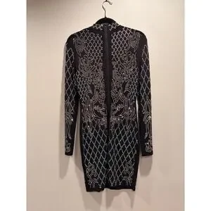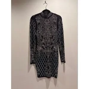 A dazzling black mini bodycon micromesh dress adorned with intricate rhinestone embellishments. This long-sleeved, mock neck dress creates a stunning silhouette, perfect for making a statement. The detailed stonework cascades across the bodice, sleeves, and hem, forming elegant patterns and a diamond grid design, ensuring you shine from every angle. The dress features a convenient back zipper closure for ease of wear. Ideal for glamorous evenings out, celebratory events, or a night of dancing.