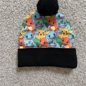 Fun Pokemon hat featuring Pikachu, Charmander, Squirtle, and Bulbasaur. Black pom-pom and cuff with Pokeball emblem.