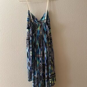 Stylish high low dress with vibrant blue and green pattern. Sleeveless design. Perfect for casual outings. Size 11/13