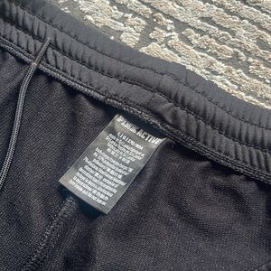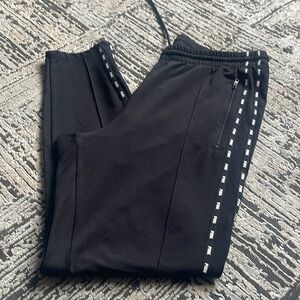 Stylish black track pants featuring white side stripes. Perfect for casual wear.