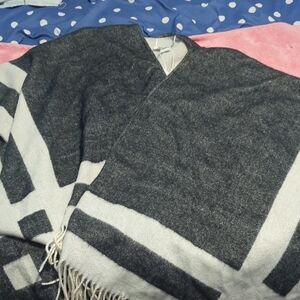 Chic knit poncho with monochrome design. Ideal for layering. Very Stylish. Can be dressed up or dressed down. when laying flat. Length measures 27 inches. Across the top measures 50 inches