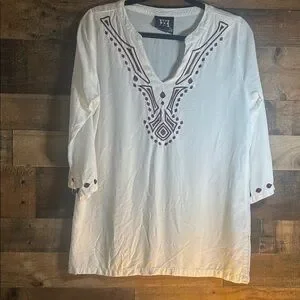 Elegant white tunic featuring intricate maroon embroidery. Perfect for a stylish look.