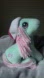 The plush toy is a My Little Pony, specifically a Generation 3 (G3) "Singing Minty" plush from 2005. It is a mint green pony with a striped pink and white mane, and is often associated with the Christmas special "A Very Minty Christmas".