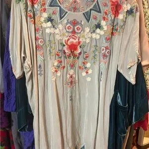 Elegant tunic with vibrant floral embroidery. Features red, blue, and white accents. Perfect for a stylish look.
