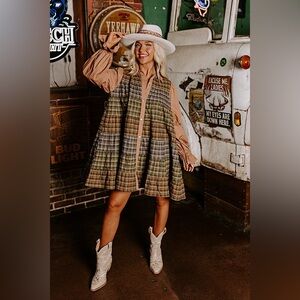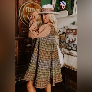 NWOT — Fantastic Fawn “Catching Feelings” flannel dress featuring a multi-color plaid patchwork pattern in earthy tones of brown, green, blue, and tan. Designed with solid contrast sleeves, a button-down front, collared neckline, and tiered babydoll silhouette. The puff sleeves and ruffled cuffs add a feminine, western-inspired touch. Oversized fit — can be worn as a dress, tunic, or shacket-style layering piece. Perfect for fall, festivals, concerts, and boho-chic styling with boots and a hat.