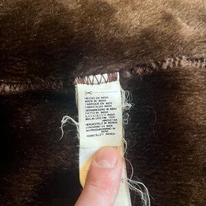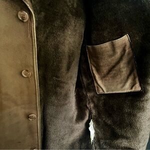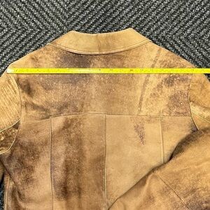 This exquisite jacket features a collared design with a button-front closure and a dark brown faux fur lining. Distressed and aged appearance with varying shades of brown throughout the exterior. The interior has 2 patch pockets.