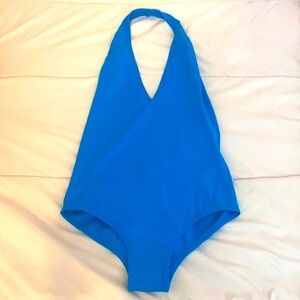 NWOT turquoise stretch halter top. Never worn in perfect t condition. Full butt cut on bottom, 3 button enclosure