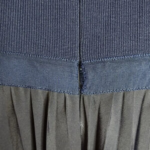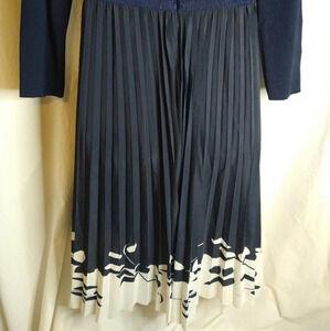 Vintage dress with knitted top, ribbon waist, and pleated bottom. Zips in the back, has a v neckline and it's pretty cute. Flaw on the back see pictures. Order it today 😊❤️👍.