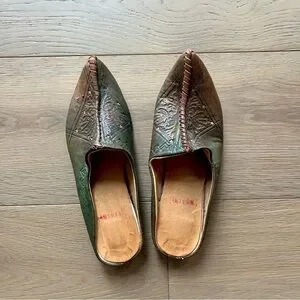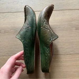 Keywords: leather slippers boho festival cottagecore elf elfin unique medieval renaissance ren faire cosplay pointed toe fairy fairycore loafers, green leather flats, embossed details, stitched accents, elvish aesthetic, handmade footwear, boho chic, festival shoes, cottagecore style, whimsical loafers, faded leather