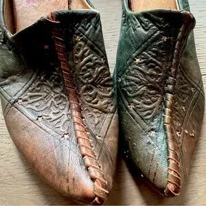 Stunning and whimsical shoes with embossing, stitched details, and an elvish vibe. I’ve kept them unworn for years, thinking I might become a cobbler so I could make them fit me… but I’m ready to admit they need a new home! There’s some wear and fading on the leather.
