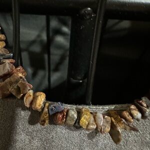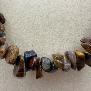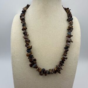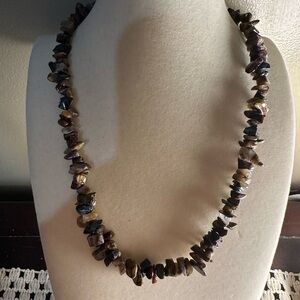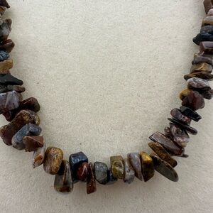 Natural Pietersite chips beaded necklace with gold tone hardware and lobster clasp. Necklace is about 15” long with 1.5” extender chain. The stone colors are a beautiful mix of dark blue, gold, red and brown.