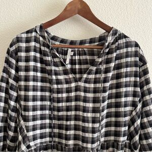 Seafolly Australia black and white gingham checkered cover up tiered dress. Long ballon sleeve with elastic wrist. V neckline with tassel tie detail. 100% cotton