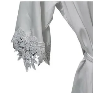 Stella Satin Lace Robe. This robe is designed with lightweight satin and lace trim around the sleeves and hem. It features a wrap-style design with a belt for secure closure and is knee-length for added coverage.