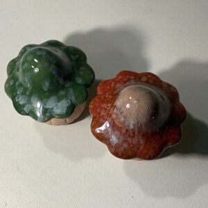Cute ceramic mushrooms with glazed tops, one in green and the other in rust.