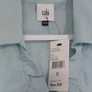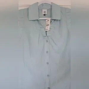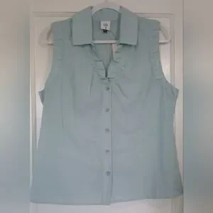 Medium size sheer sleeveless blouse by Cabi. Light blue color with a button-down front. Ideal for casual or office wear! New with tags.
