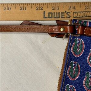 This is a preowned leather Dooney & Bourke Florida Gators crossbody purse. Exterior is in mint condition. Interior could use a little cleaning. (SEE PICS)It has 1 zippered main pocket & 2 outside 7 1/2” pockets. It has a 24” adjustable drop. It measures approximately 8” X 7.75” X.25.