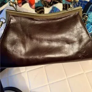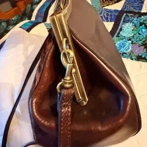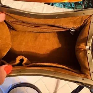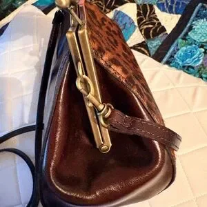 Stylish Patricia Nash leopard print women's bag featuring a chic tan handle. Perfect for adding a touch of wild elegance to any outfit. 10”x7”x5”