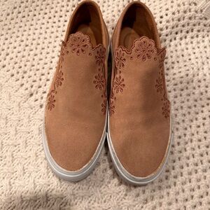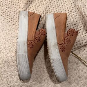 Stylish brown suede slip-on sneakers featuring a delicate floral design. Perfect for casual outings.