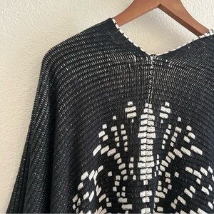 Open front cardigan. Oversized fit, wide sleeves, and no buttons or zippers. Black and white Aztec tribal pattern. -00% natural fibers. Cotton and wool blend.