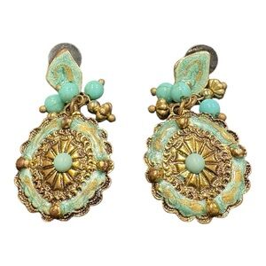 Vintage Gold Tone Turquoise Beaded Medallion Drop Earrings Boho Chic J19
