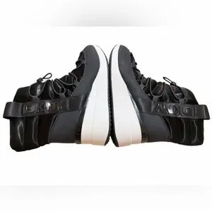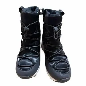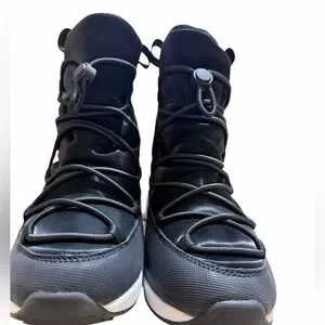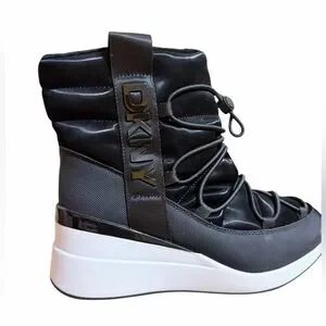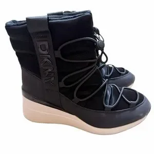 Stylish DKNY winter boots with a sleek black upper and white sole. Perfect for cold weather.