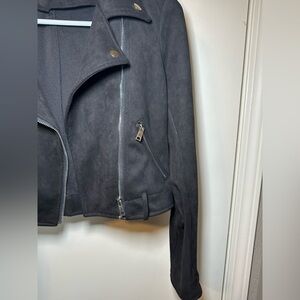 Chic black moto jacket. Features silver zippers and buttons. Stylish and versatile.