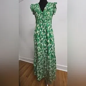 Chic green midi dress with floral pattern. Features a V-neck and short sleeves. Perfect for a stylish look.