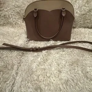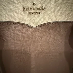 Chic Kate Spade satchel in tan and cream. Features elegant design with sturdy handles. Ideal for versatile styling.