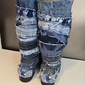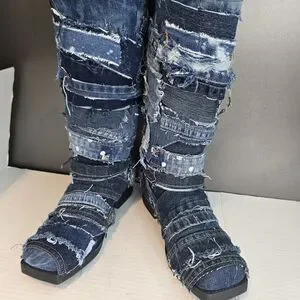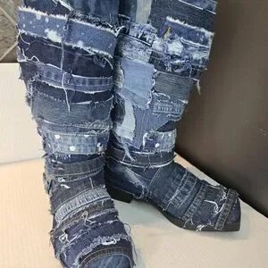 Unique patchwork denim boots with a rugged design. Perfect for a bold fashion statement.