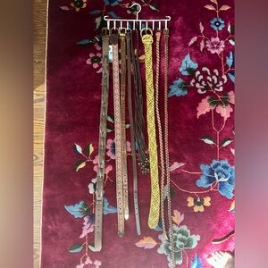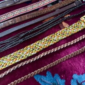 This belt is still very much like new! Labeled a medium but decently long, a must-have for your wardrobe. Braided belts are fastened by sticking the metal tab in the middle of the braid for an adjustable fit.