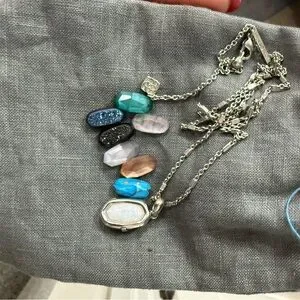 Chic silver necklace featuring interchangeable stones. Comes with bag and stones. Chain is adjustable