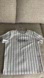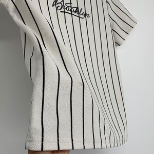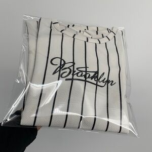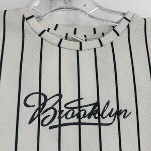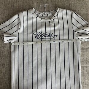 Stylish cream t-shirt with black stripes. Features 'Brooklyn' text on front. Perfect for casual wear. Used with signs of it, but still in acceptable condition.