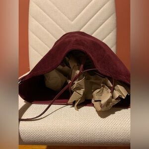 NWT J. Crew Berkeley bucket bag. Oxblood color. Soft suede and smooth leather. Tie closure at the top. No pockets or hardware. Super chic, minimalist design. See screen shot from J. Crew site for measurements.