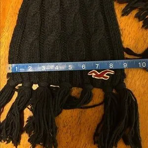 Hollister navy knit scarf with fringe detail. Features Hollister logo.
