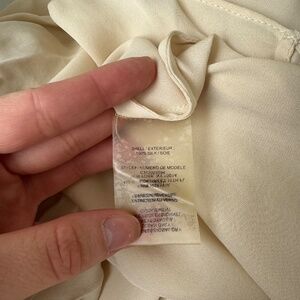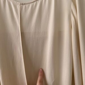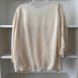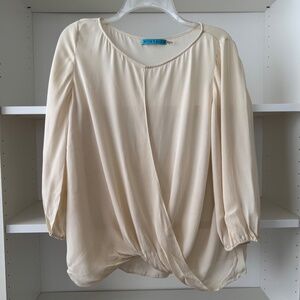 Alice + Olivia Brad Long Draped Crisscross cream Silk Blouse. Boatneck. Long sleeves with elasticized cuffs. Draped crisscross front. Partially sheer. Approx. 24" length. 100% silk. Good preloved condition, one tiny spot in the front, no other major flaws. Size medium.