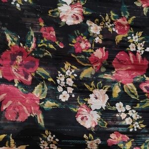 Elegant blouse with bold floral design. Features red and white flowers on a black base. Perfect for versatile styling.