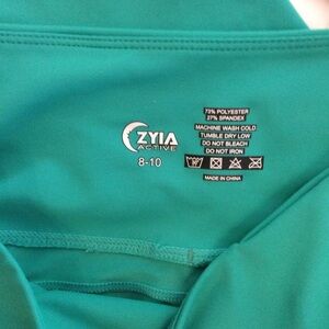 Zyia women’s green activewear stretch leggings with pockets in a size 8 to 10. Measure approximately 14 inches across the waist and have an approximate 21 inch inseam. these leggings are in excellent condition so comfortable and so cute. fabric is 73% polyester and 27% spandex. Worn only a couple times