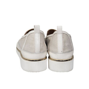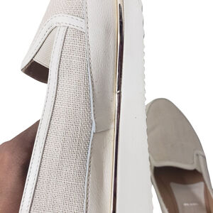 FEATURES: Cavas like fabric upper, rounded toe and a low-profile silhouette. A thin gold accent above platform sole, ultra light rubber wedge, sleek and sophisticated.
