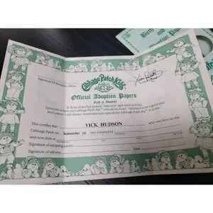 This listing is for a preowned and never displayed Cabbage Patch doll from 1985. The birth certificate for Vick Hudson was never filled out. I see that there is some additional paperwork included from a different year. I'm not sure where that came from, but I am including it as well. Please review the photos as the box is in pretty rough shape. The clear plastic front is no longer there and the doll was kept in a plastic bag to protect it. Add to your collection.
