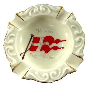 Charming vintage porcelain miniature ashtray from Denmark featuring the Danish flag and the words “Hilsen fra Ribe” (translating to “Greetings from Ribe,” one of Denmark’s oldest towns).