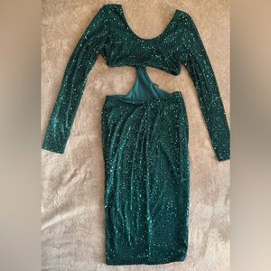Stunning teal dress with sequins. Long sleeves. Elegant cut-out design.