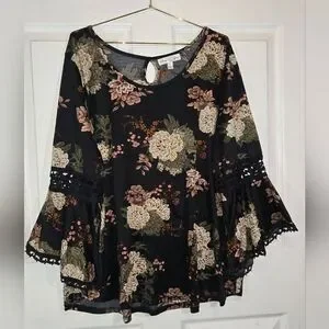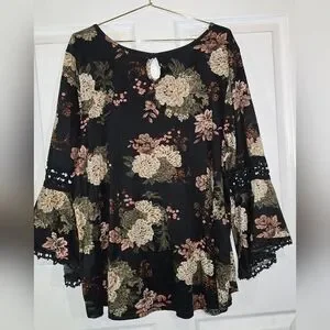 Embrace elegance with this floral bell sleeve blouse. Featuring a black base adorned with floral patterns, a key hole detail on the back, and lacy detail on sleeves