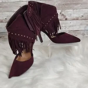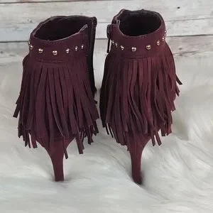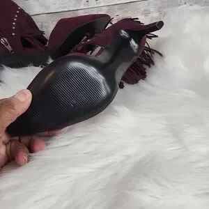 Nine West, women's Burgandy fringed suede heels, small gold hardware, Sz 6 1/2