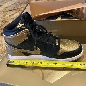 NIB NIKE AIR JORDAN 1 LEATHER HIGH OG BLACK/METALLIC GOLD FD1437 BOYS SIZE 7