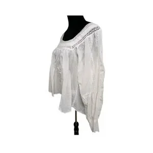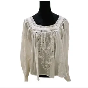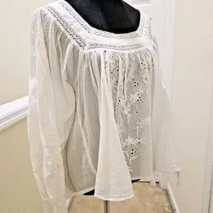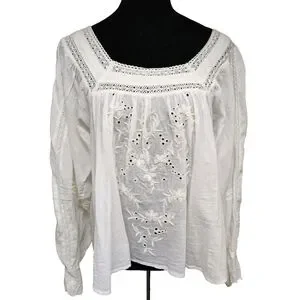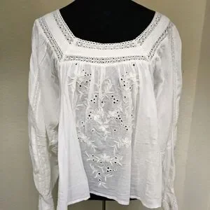 This Chelsea & Theodore elegant white embroidered blouse features a button-down back, perfect for any occasion. Its lightweight fabric ensures comfort and style.