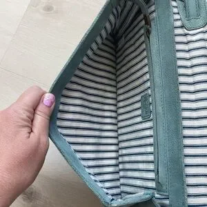 •Has an interior zip pocket. Overall great condition, genuine nubuck leather bag in a soft aqua color.