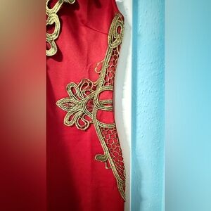 Step out in style with this elegant red dress featuring exquisite gold floral detailing. Perfect for any special occasion.