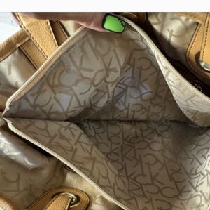 Stylish Calvin Klein tote. Features brown monogram pattern. Tan handles and trim. Perfect for everyday use.