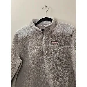 The Vineyard Vines Women's Medium Shep Shirt is a cozy and stylish preppy sweater perfect for the colder seasons of Winter and Fall. Made from polyester fleece material, this pullover sweater features a solid gray color, long sleeves, and a mock neck neckline with a 1/4 zip detail. With a comfortable regular fit, this sweater is great for travel, casual outings, or workwear, making it a versatile addition to any wardrobe. The brand's quality and attention to detail ensure a stylish and comfortable look for the modern woman.